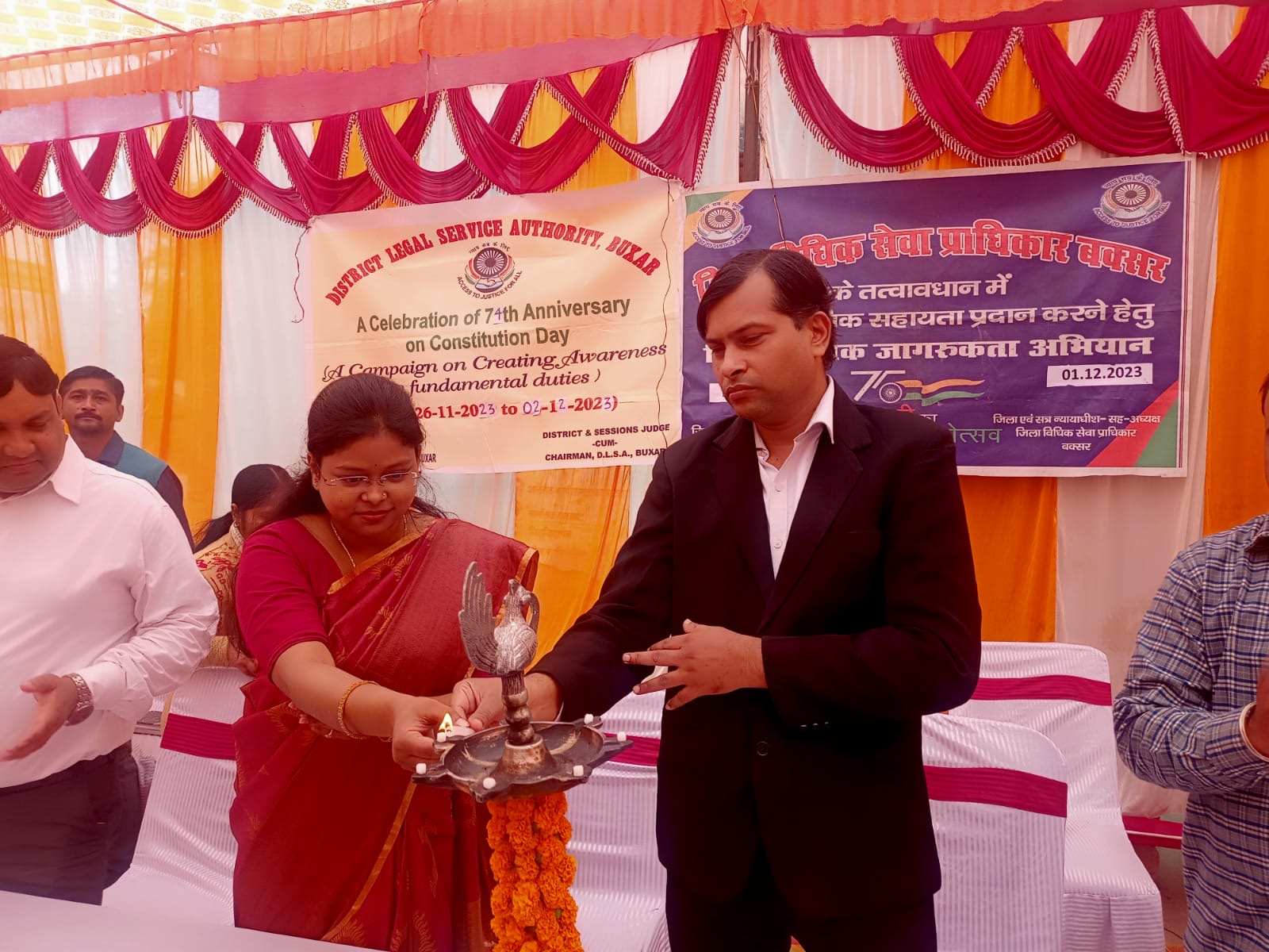 बिहार राज्य विधिक सेवा प्राधिकार, पटना के निर्देशानुसार जिला विधिक सेवा प्राधिकार, बक्सर एवं जिला विधि शाखा समाहरणालय, बक्सर के संयुक्त तत्वाधान में संविधान दिवस के अवसर पर जागरूकता पखवाड़ा मनाया जा रहा है। इसको लेकर शुक्रवार को स्थानीय बक्सर, सदर प्रखंड परिसर में एकदिवसीय जागरूकता विशेष कैंप का आयोजन किया गया। जिसका विधिवत उद्घाटन अवर न्यायाधीश सह-सचिव, जिला विधिक सेवा प्राधिकार, बक्सर देवेश कुमार एवं निधि ज्योत्सना अंचलाधिकारी, बक्सर द्वारा संयुक्त रूप से दीप प्रज्वलित कर किया गया। इस विशेष मेगा कैंप में जिला परिवहन, आईसीडीएस, वन स्टॉप सेंटर, श्रम विभाग, स्वास्थ्य विभाग, आयुष्मान योजना, विधिक सहायता, दिव्यांगजन सशक्तिकरण आपूर्ति समेत विभिन्न विभागों के 22 स्टाल लगाए गए थे। जिसके माध्यम से महत्वपूर्ण जन उपयोगी विभागीय योजनाओं की जानकारी आम जनों को दी गई और बहुत से लाभूको को ऑन स्पॉट योजनाओं का लाभ भी दिया गया। इस योजना के अंतर्गत पूनम किन्नर, पपिया किन्नर, गुनगुन किन्नर आदि लोगों को जो बैंक खाता खोलना चाहते हैं, पैन कार्ड एवं आधार कार्ड के निर्माण का आवेदन दिया गया। अन्य योजनाओं का लाभ देते हुए कृष्ण अवतार गोंड को किसान लोन योजना के अंतर्गत उनके वाद का निस्तारण कराया गया। पुलेंद्र कुमार सिंह जिनके खेत के आगे एक वयक्ति जो छह वर्ष है और उस पर सरकारी जमीन पर किसी ने अवैध कब्जा और निर्माण कर रखा है उसकी जमीन पर उन्हें हटाने के लिए माननीय अंचलाधिकारी द्वारा निर्देश दिया गया। अन्य आवेदनों के निपटारे में गिरिजा देवी, ममता देवी, दिव्यांशी कश्यप, तितली कुमारी, बच्चू लाल, लक्ष्मीना देवी, कश्मीरा देवी आदि द्वारा अपनी अपनी समस्याओं का निष्पादन के लिए आवेदन दिया गया। मौके पर स्वास्थ्य विभाग की ओर से आयुष्मान भारत योजना के अंतर्गत आयुष्मान गोल्डन कार्ड का वितरण किया गया। जिसमें विजय चौधरी, बेदानिया देवी, सुमन कुमारी एवं हरिशंकर राम इसके लाभार्थी रहे। इन सभी लाभार्थियों को आयुष्मान योजना के अंतर्गत भारत सरकार द्वारा ₹5,00,000/- पाँच लाख रूपए प्रति वर्ष का निशुल्क चिकित्सीय लाभ दिया जाएगा। मनरेगा योजना के अंतर्गत सिंधु देवी, अनिरुद्ध चौहान, अशोक ठाकुर, मीना देवी, आशा देवी, मंजू देवी, चंद्रावती देवी आदि को जॉब कार्ड का वितरण किया गया। वहीं कृष्णानंद सिंह, चंदन कुमार, शेख वसीम बड़की सारीमपुर के रहने वाले को दाखिल खारिज मामले में शुद्धि पत्र का वितरण किया गया। पारसनाथ उपाध्याय, बलवीर सिंह उपाध्याय, किरण देवी आदि को भूमि दखल कब्जा प्रमाण पत्र साथ ही पारिवारिक सूची प्रमाण पत्र का लाभ दिया गया। जाति प्रमाण पत्र एवं चरित्र प्रमाण पत्र के मामले में त्वरित कार्रवाई करते हुए प्रदुमन कु