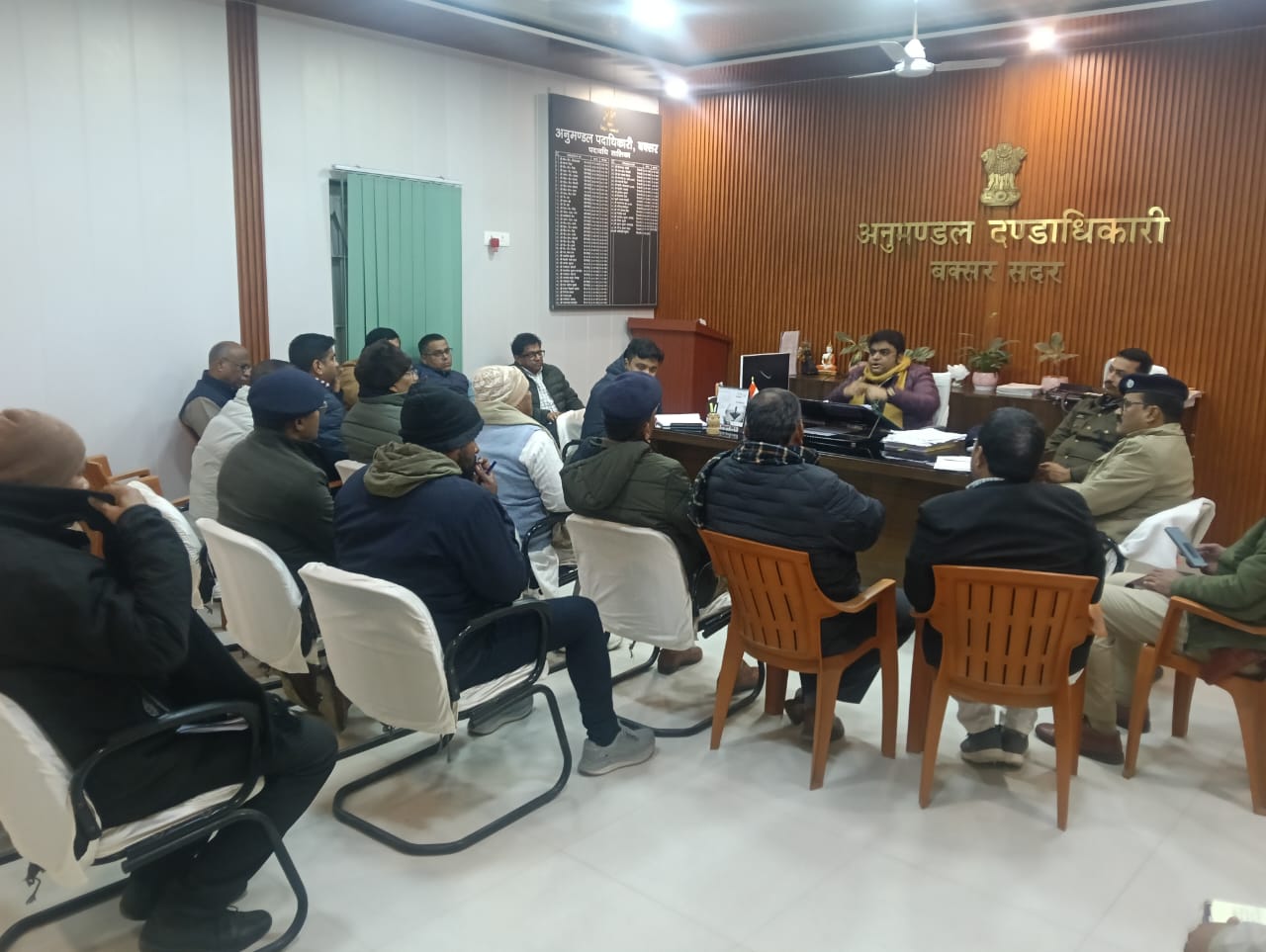 अनुमंडल पदाधिकारी बक्सर के कार्यालय कक्ष में आगामी पर्व-त्यौहार यथा मकर संक्रांति एवं मौनी अमावस्या को दृष्टिगत रखते हुए शांति समिति की एक बैठक आहूत की गई जिसमें अनुमंडल पुलिस पदाधिकारी, बक्सर, अंचल अधिकारी, बक्सर, कार्यपालक पदाधिकारी, नगर परिषद बक्सर, थानों के थानाध्यक्ष एवं शांति समिति के सदस्य उपस्थित हुए। शांति समिति के सदस्यों ने मकर संक्रांति एवं मौनी अमावस्या के अवसर पर बक्सर शहर में यातायात प्रबंधन पर अपने विचार व्यक्त किया। सदस्यों ने बताया कि बक्सर शहर में ई रिक्शा को रेगुलेट करने की जरूरत है। अनुमंडल पदाधिकारी बक्सर ने सदस्यों को आश्वासन देते हुए बताया कि जिला परिवहन पदाधिकारी बक्सर को पत्र के माध्यम से सूचित किया जाएगा कि ई-रिक्शा निबंधन से संबंधित जानकारी अधोहस्ताक्षरी एवं शांति समिति के सदस्यों के साथ साझा करें। अभी तक ई-रिक्शा के किए गए निबंधन से संबंधित प्रतिवेदन की मांग की जाएगी। मकर संक्रांति के अवसर पर वाहनों का मार्ग निर्धारण भी तय किया गया। बैठक में ज्योति चौक से किला मैदान बक्सर एवं किला मैदान से आईटीआई मोड़ तक नो एंट्री जोन घोषित किया गया। सदस्यों ने अनुरोध किया कि आगामी त्योहारों के अवसर पर नगर में बड़े वाहनों का प्रवेश प्रतिबंधित किया जाए। अनुमंडल पदाधिकारी ने सदस्यों को आश्वस्त किया की मकर संक्रांति एवं मौनी अमावस्या के समय शहर में पड़ने वाली है कड़ाके की ठंड से राहत दिलाने के लिए जगह-जगह पर अलाव जलाने की व्यवस्था की जाएगी। गंगा घाटों पर स्नान करते समय होने वाली दुर्घटना को ध्यान में रखते हुए एसडीआरएफ की प्रतिनियुक्ति की जाएगी। नगर परिषद बक्सर को निर्देशित किया गया कि गंगा घाटों पर सीसीटीवी कैमरा अधिष्ठापन करें। माननीय सदस्यों के अनुरोध पर चलन्त शौचालय स्थापित करने का निर्देश नगर परिषद बक्सर को दिया गया नगर परिषद बक्सर को यह भी निर्देश दिया गया कि आगामी पर्व त्योहारों के पूर्व रामरेखा घाट पर किए गए अतिक्रमण को रूटिंग बनाकर हटाने की कार्रवाई करें।