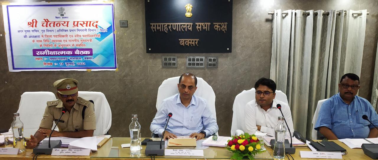 श्री चैतन्य प्रसाद, अपर मुख्य सचिव, गृह विभाग (अतिरिक्त प्रभार निगरानी विभाग), बिहार की अध्यक्षता में जिला पदाधिकारी एवं पुलिस अधीक्षक बक्सर के साथ विधि व्यवस्था एवं माननीय मुख्यमंत्री के निर्देशों के अनुपालन से संबंधित समीक्षात्मक बैठक समाहरणालय स्थित सभागार में आहूत की गई।**समीक्षा बैठक में कब्रिस्तान घेराबंदी योजना अंतर्गत स्वीकृत योजनाओं को यथा शीघ्र पूर्ण कराने का निर्देश दिया गया।**अपर मुख्य सचिव महोदय के द्वारा विधि व्यवस्था, भूमि विवाद, अभियोजन स्वीकृति, स्पीडी ट्रायल एवं डीएलएमसी की बैठक की समीक्षा की गई और स्पीडी ट्रायल के मामलों को प्राथमिकता के आधार पर समयबद्ध निष्पादन का प्रयास करने का निर्देश दिया गया।**गृह विभाग से संबंधित विषयों की समीक्षा की गई और संबंधित पदाधिकारियों को जरूरी दिशा निर्देश दिए गए।**अपर मुख्य सचिव महोदय के द्वारा केंद्रीय कारागार का निरीक्षण किया गया और निरीक्षण के क्रम में कारा अधीक्षक एवं अन्य संबंधित पदाधिकारियों को जरूरी दिशा निर्देश दिए गए।**बैठक में जिला पदाधिकारी बक्सर, पुलिस अधीक्षक बक्सर, अपर समाहर्ता बक्सर, अपर समाहर्ता सह जिला लोक शिकायत निवारण पदाधिकारी बक्सर, वरीय उप समाहर्ता बक्सर, जिला स्तरीय पदाधिकारीगण, पीपी एवं जीपी उपस्थित थे।