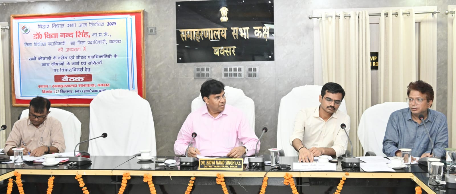 जिला निर्वाचन पदाधिकारी सह जिला पदाधिकारी बक्सर, डॉ विद्यानंद सिंह की अध्यक्षता में आगामी बिहार विधानसभा आम निर्वाचन 2025 के सफल आयोजन हेतु सभी कोषांग के वरीय पदाधिकारियों एवं नोडल पदाधिकारियों के साथ समीक्षा बैठक समाहरणालय परिसर स्थित सभाकक्ष में की गई ।