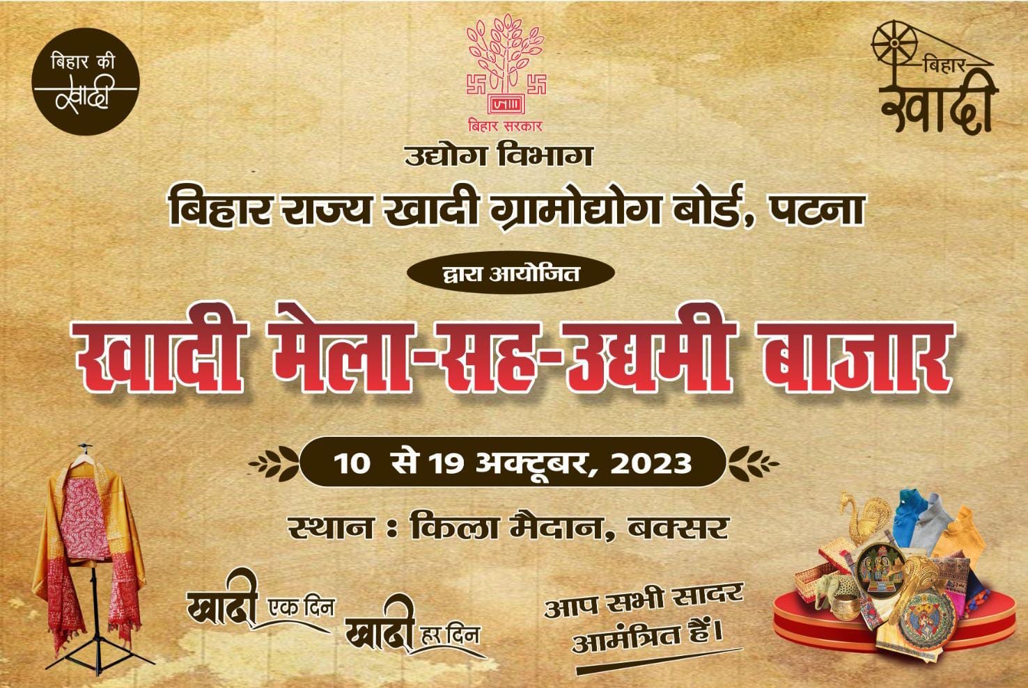 बिहार राज्य खादी ग्रामोद्योग बोर्ड द्वारा बक्सर के किला मैदान में राज्य स्तरीय खादी मेला सह उद्यमी बाजार 10 अक्टूबर 2023 से लगाया जाएगा जिसमें पूरे राज्य की 100 से अधिक खादी एवं ग्रामोद्योग संस्थाएं भाग लेंगी। खादी मेला 19 अक्टूबर तक चलेगा। बिहार राज्य खादी ग्रामोद्योग बोर्ड के मुख्य कार्यपालक पदाधिकारी दिलीप कुमार ने बताया कि खादी मेला में राज्य के सभी जिलों की खादी एवं ग्रामोद्योग संस्थानों को भाग लेने के लिए आमंत्रित किया गया है। उद्यमी बाजार में बक्सर जिला के मुख्यमंत्री उद्यमी योजना के लाभार्थियों अपने द्वारा तैयार माल को प्रदर्शित एवं बिक्री करेंगे।