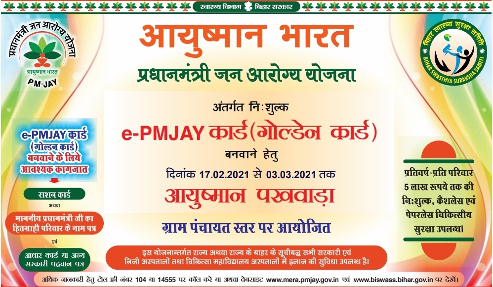 आयुष्मान भारत प्रधानमंत्री जन आरोग्य योजना (AB-PMJAY) के अंतर्गत 1.09 करोड़ पात्र लाभार्थी परिवार में से जिन्हें e-card (गोल्डेन कार्ड) प्राप्त नहीं है, उन्हें गोल्डेन कार्ड उपलब्ध कराने हेतु दिनांक 17.02.2021 से दिनांक 03.03.2021 तक सरकार द्वारा आयुष्मान पखवाड़ा आयोजित किये जाने का निर्णय लिया गया है। इसमें सभी पंचायत के आर0टी0पी0एस0 पोर्टल पर 15 दिनों तक गोल्डेन कार्ड निर्माण का विशेष अभियान चलाया जायेगा। गोल्डेन कार्ड निर्माण हेतु पंचायत स्तर पर शिविर का आयोजन किया जा रहा है, जिसमें पंचायती राज विभाग के कार्यपालक सहायकों द्वारा पात्र लाभार्थी का निःशुल्क गोल्डेन कार्ड निर्माण एवं वितरण किया जायेगा। सभी पात्र लाभार्थियों के गोल्डेन कार्ड निर्माण सुनिश्चित करने के लिए पात्र लाभार्थियों की सूची संबंधित प्रखण्ड विकास पदाधिकारी को उपलब्ध कराया जा रहा है। प्रखण्ड विकास पदाधिकारी के माध्यम से पंचायती राज प्रतिनिधि एवं वार्ड सदस्य तक पात्र लाभार्थियों की सूची उपलब्ध करायी जायेगी। पात्र लाभार्थियों की सूची www.biswass.bihar.gov.in वेबसाइट पर उपलब्ध कराया जा रहा है। लाभार्थी अपनी पात्रता जानने के लिए टॉल फ्री नंबर 14555/104 पर कॉल कर सकते है। शिविर के आयोजन हेतु जिला क्रियान्वयन इकाई, बिहार स्वास्थ्य सुरक्षा समिति द्वारा माइक्रो प्लान तैयार किया जा रहा है। पखवाडे़ के दौरान पात्र लाभार्थियों का वेरीफिकेशन होगा एवं ई-कार्ड सृजित करने का ऑन लाइन निवेदन प्रेषित होगा, जिसे राज्य स्तर पर अनुमोदित किया जायेगा। कोविड-19 को ध्यान में रखते हुए सोशल डिस्टेसिंग सहित कोविड-19 के संबंध में सरकार द्वारा निर्गत दिशा-निर्देशों का अनुपालन अनिवार्य रूप से किया जायेगा।