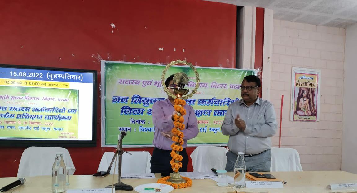 एमपी हाई स्कूल परिसर में अवस्थित विश्वामित्र भवन में आयोजित नवनियुक्त राजस्व कर्मचारियों का जिला स्तरीय प्रशिक्षण कार्यक्रम का शुभारंभ जिला पदाधिकारी बक्सर श्री अमन समीर के द्वारा दीप प्रज्वलित कर किया गया। यह प्रशिक्षण 15 सितंबर से 28 सितंबर तक जारी रहेगा। जिला पदाधिकारी महोदय ने राजस्व कर्मचारियों को उनके कर्तव्य एवं कार्य के प्रति जिम्मेदारी से अवगत कराया।