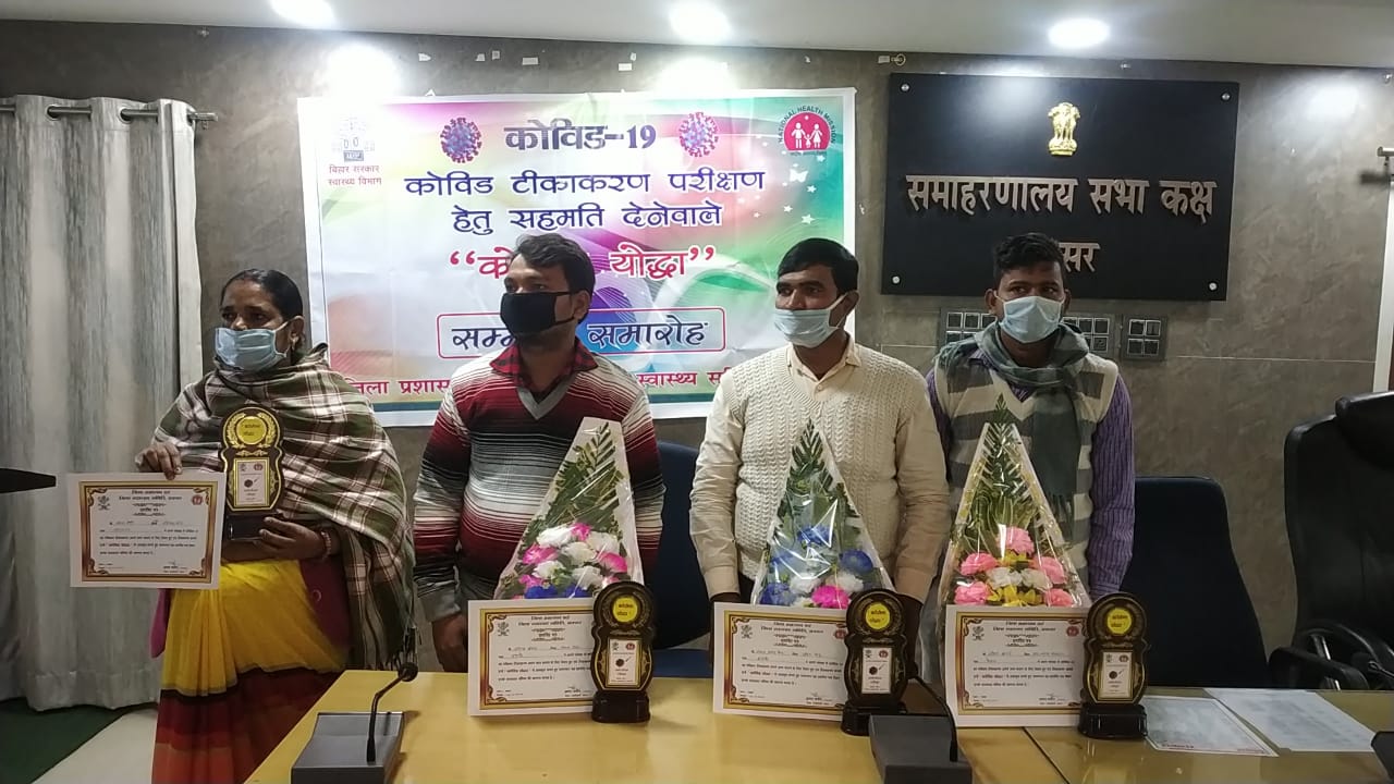 कोविड-19 वैक्सीन का ट्रायल देने हेतु एम्स पटना जाने वाले चार कोविड फ्रंटियर योद्धाओं को जिला पदाधिकारी बक्सर श्री अमन समीर के द्वारा प्रशस्ति पत्र, शील्ड एवं बुके देकर सम्मानित किया गया। सभी सरकारी कर्मी हैं। इनके नाम हैं :- केसठ प्रखण्ड के राजेश कुमार, पिता- श्री रामचन्द्र पासवान, नावानगर प्रखण्ड की सफाईकर्मी माया देवी, पति- वशिष्ट साह, इटाढी प्रखण्ड के उपेन्द्र कुमार, पिता- राधा पात्र, इटाढ़ी प्रखण्ड के ही संजय कुमार सिंह, पिता- सुरेश सिंह है। जिला पदाधिकारी महोदय ने चारो को सम्मानित करते हुए उनके इस महान कार्य के लिए धन्यवाद भी दिया। उन्होंने बताया कि मानव जाति के लिए संकट उत्पन्न करने वाला कोरोना वायरस का अंत इस वैक्सीन से ही होगा। यह ट्रायल तृतीय एवं अंतिम चरण का है। उन्होंने इसे अत्यंत सुरक्षित बताया। वैक्सीन का ट्रायल कोई भी 18 वर्ष आयु से ज्यादा वालों पर किया जा सकता है। वैक्सीन का ट्रायल मधुमेह, अन्य गंभीर बीमारी वालों पर भी किया जा सकता है। सिर्फ गर्भवती महिला एवं कोविड-19 संक्रमण से ग्रसित व्यक्ति (वर्तमान एवं पूर्व) ट्रायल में शामिल नहीं हो सकते है। इसके लिए सिर्फ आधार कार्ड की आवश्यकता पड़ती है। वैक्सीन ट्रायल के पहले कोविड टेस्ट, खून की जाँच की जाती है। ट्रायल में जाने वाले व्यक्ति को 750=00 रूपया भाडे़ के एवज में दिया जाता है। पहले डोज के 28 दिनों के बाद दूसरा डोज हेतु पुनः एम्स पटना जाना पडे़गा। बक्सर जिला से कोविड-19 वैक्सीन का ट्रायल हेतु जाने वाले इच्छुक लोग जिला स्वास्थ्य समिति के डी0पी0एम0 संतोष कुमार से उनके मोबाईल नम्बर 9771830122 पर सम्पर्क कर सकते है। सम्मान समारोह में सिविल सर्जन बक्सर, विशेष कार्य पदाधिकारी गोपनीय प्रशाखा, जिला जन सम्पर्क पदाधिकारी बक्सर, जिला कार्यक्रम प्रबंधक एवं अन्य कर्मीगण उपस्थित थे।