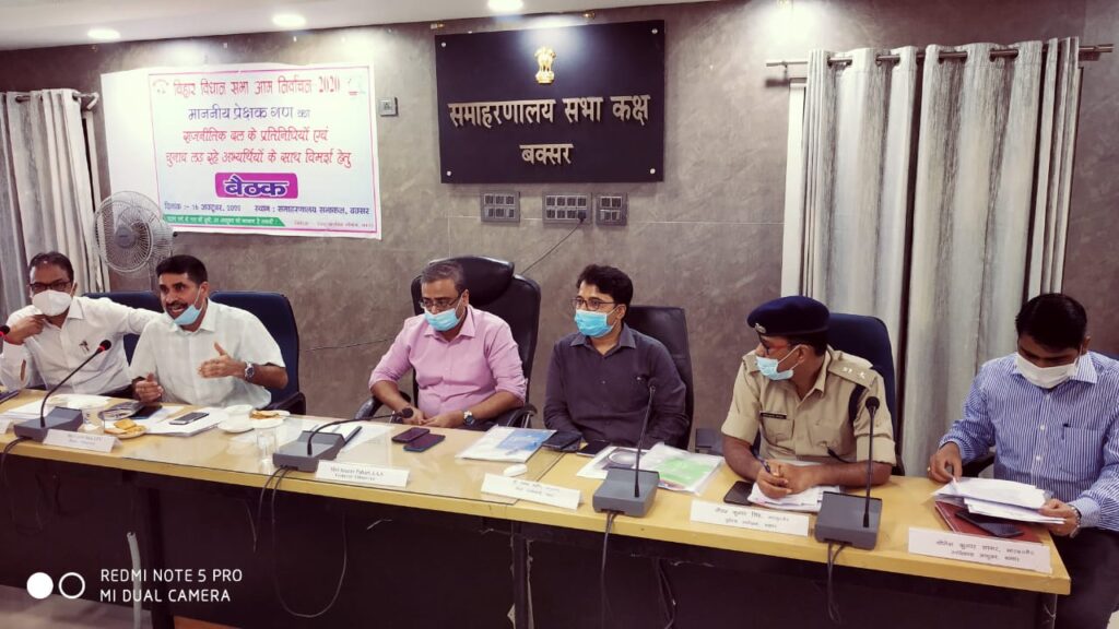 बिहार विधान सभा आम निर्वाचन, 2020 के क्रम में निर्वाचन से संबंधित विषयों पर दिनांक-16.10.2020 (शुक्रवार) को 11:30 पर पूर्वाहन में प्रेक्षणगण (सामान्य, पुलिस एवं व्यय) के साथ निर्वाचन लड़ने वाले अभ्यर्थियों एवं निर्वाची पदाधिकारियों के साथ विमर्श समाहरणालय बक्सर के सभागार में किया गया। विमर्श में भारत निर्वाचन आयोग के दिशा-निर्देश की जानकारी एवं उनके अक्षरशः अनुपालन हेतु निदेश दिया गया। इसी क्रम में आदर्श आचार संहिता के संबंध मे बताया गया कि किसी भी धर्म से संबंधित द्वेष फैलाने वाले किसी तरह के भाषण पर पाबंदी रहेगी एवं किसी भी धार्मिक स्थल का इस्तेमाल चुनाव प्रचार के लिए नहीं होगा। चुनाव प्रचार से संबंधित किसी भी तरह का जुलूस, रैली, नुक्कड़ नाटक, लाउडस्पीकर एवं वाहन का प्रयोग करने हेतु निर्धारित तिथि से कम से कम 48 घंटे पहले संबंधित अनुमण्डल के अनुमण्डल पदाधिकारी से अनुमति प्राप्त करना अनिवार्य होगा। संपूर्ण क्षेत्र के लिए जिला स्तरीय एकल खिड़की कोषांग से अनुमति प्राप्त की जा सकती है। किसी भी सरकारी/निजी जमीन एवं मकान पर चुनाव प्रचार से संबंधित पोस्टर/बैनर लगाने पर पाबंदी है। किसी भी शैक्षणिक संस्थान का प्रयोग चुनाव प्रचार/सभा हेतु किया जा सकता है, किन्तु संस्थान के प्राचार्य से लिखित में उस स्थल की अनुमति होनी चाहिए। चुनाव प्रचार हेतु वाहन पर अधिकतम एक झंडा एवं एक पोस्टर/बैनर से ज्यादा नहीं लगाना है। चुनाव प्रचार हेतु डमी ई0वी0एम0 मशीन का प्रयोग किया जा सकता है, किन्तु शर्त यह है कि वह निर्धारित मात्रक से आधे साईज का हो तथा लकड़ी/प्लाईवुड से निर्मित हो। पार्टी कार्यालय के संबंध में निदेश दिया गया कि पार्टी कार्यालय सरकारी कार्यालय, शैक्षणिक संस्थान एवं धार्मिक स्थल से 200 मी0 के दायरे में नहीं हो। पार्टी कार्यालय में 04‘ X 08’ का एक बैनर/पोस्टर लगाया जा सकता है। पोलिंग ऐजेंट के संबंध में निदेश दिया गया कि प्रत्येक दल अपना एक पोलिंग ऐजेंट मतदान केन्द्र पर प्रतिनियुक्त कर सकता है, किन्तु पोलिंग ऐजेंट का नाम उस मतदान केन्द्र के मतदाता सूची में अनिवार्य रूप से जुड़ा होना चाहिए। राजनैतिक दल चाहे तो मतदान के दिन केन्द्र से 200 मीटर के दायरे से बाहर अपना बुथ बना सकते है, जिसमें किसी तरह का पार्टी बैनर/पोस्टर का प्रयोग वर्जित रहेगा। मतदान तिथि से 48 घंटे पूर्व यानि दिनांक-26.10.2020 के 06ः00 बजे अपराह्न के पश्चात सभी तरह के चुनाव प्रचार पर पूर्णतः पाबंदी रहेंगी। मतदान के दिन अधिकतम दो वाहन प्रयोग किया जा सकता है, मतदान के दिन अधिकतम दो वाहन प्रयोग किया जा सकता हैं, जिसमें एक में उम्मीदवार एवं दूसरे वाहन में पार्टी कार्यकर्ता प्रयोग कर सकते हैं, तथा वाहन के मुख्य शीशे पर अनुमति पत्र चस्पा होना चाहिए।चु