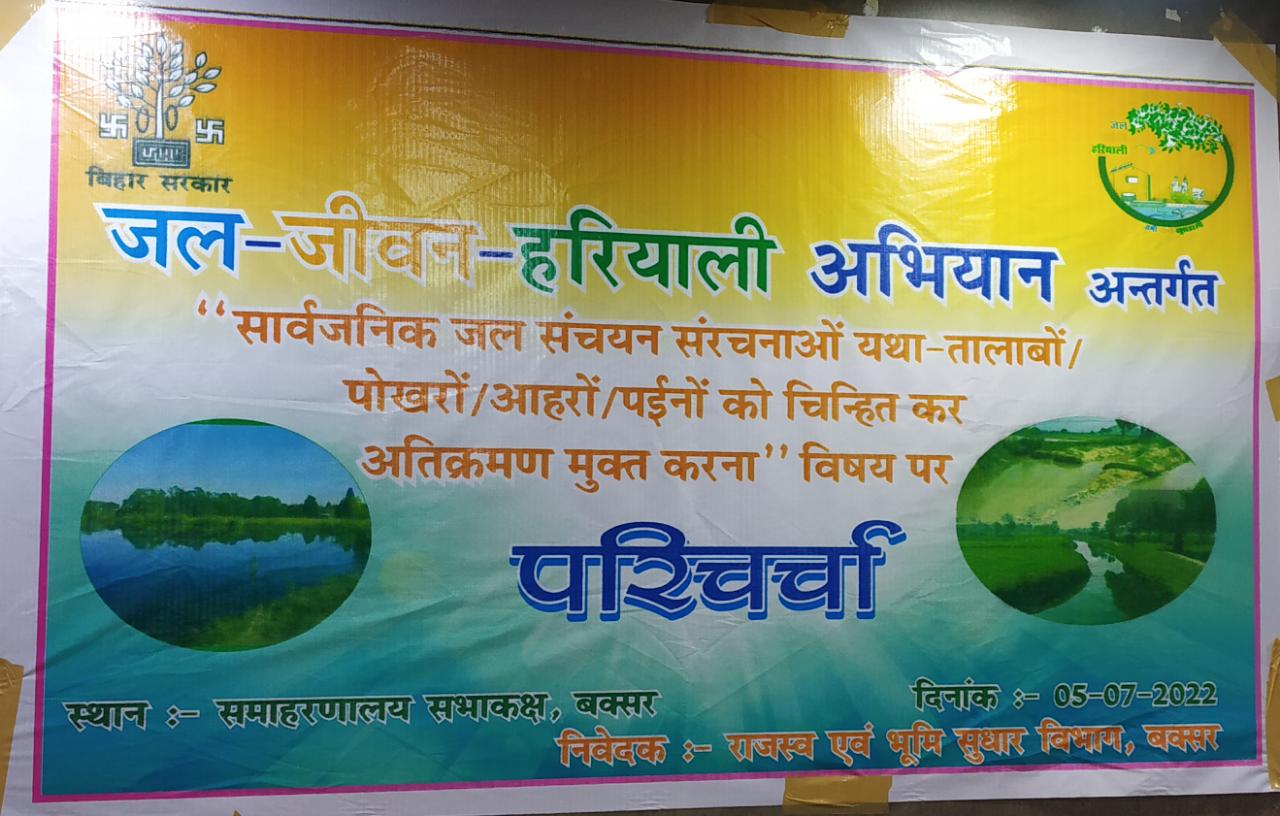 जल जीवन हरियाली अभियान अंतर्गत सार्वजनिक जल संचयन संरचनाओं यथा-तालाबों, पोखरों, आहरों, पईनों को चिहिन्त कर अतिक्रमण मुक्त करना विषय पर परिचर्चा समाहरणालय अवस्थित सभागार में की गई। कार्यक्रम का शुरूआत दीप प्रज्जवलित कर किया गया। अपर समाहर्ता बक्सर ने अपने संबोधन में कहा कि वर्तमान परिस्थिति में जलवायु परिवर्तन के कारण बहुत ही समस्याएं उत्पन्न हो रही हैं। हम सबको अपने आसपास अधिक से अधिक वृक्षारोपण करते हुए जल जीवन हरियाली को बढावा देना चाहिए ताकि जलवायु परिवर्तन को रोका जा सके। जल जीवन हरियाली अंतर्गत 09 विभाग द्वारा 11 अवयव शामिल है। वर्तमान परिस्थिति में भूमि का जल स्तर नीचे जा रहा है हम सबको जल संचयन एवं जल जीवन हरियाली अभियान के अंतर्गत इस जल स्तर को बढ़ाने का प्रयास करना चाहिए। ज़िला परिषद अध्यक्षा ने सभी लोगों से अपील किया कि अपने आसपास का वातावरण स्वच्छ रखें अधिक से अधिक पेड़ लगाएं साथ ही जल संचयन के सभी उपायों का अनुपालन करें। कार्यक्रम में सबके द्वारा संकल्प भी लिया गयाः- मैं संकल्प लेता/लेती हूँ कि प्रत्येक वर्ष कम से कम एक पौधा लगाकर उसकी सुरक्षा एवं देखभाल कर वृक्ष बनाऊँगा/बनाऊँगी। अपने आस-पास के तालाब, नदी, पोखर एवं अन्य जल स्रोतों को प्रदुषित नहीं करूँगा/करूँगी। आवश्यकता से अधिक जल का उपयोग नहीं करूँगा/करूँगी एवं इस्तेमाल के बाद नल को बंद करूँगा/करूँगी। अपने घर/विद्यालय पास-पडो़स में वर्षा के जल संचयन हेतु अपने परिवार के सदस्यों को प्रेरित करूँगा/करूँगी। बिजली का उपयोग आवश्यकतानुसार ही करूँगा/करूँगी। घर के बाहर निकलते समय बिजली के बल्ब/पंखा को बंद कर दूगाँ/दूँगी। अपने घर, विद्यालय एवं आस-पडो़स को स्वच्छ रखते हुए वहाँ से निकलने वाले कूडे़ को कूडे़दान में डालूँगा/डालूँगी। प्लास्टिक/पॉलीथीन का उपयोग बंद कर कपडे़/कागज का उपयोग करूँगा/करूँगी और अन्य लोगों को भी उसके लिए प्रेरित करूँगा/करूँगी। जीव-जन्तुओं एवं पशु-पक्षियों के प्रति प्रेम का भाव रखूँगा/रखूँगी। इनके लिए यथा संभव दाना-पानी की व्यवस्था करूँगा/करूँगी। नजदीक के कार्य पैदल अथवा साईकिल से करूँगा/करूँगी। कागज का अनावश्यक उपयोग नहीं करूँगा/करूँगी एवं अन्य लोगों को भी इस हेतु प्रेरित करूँगा/करूँगी। मैं खुले में शौच नहीं कर शौचालय का उपयोग करूँगा/करूँगी।* *कार्यक्रम में अपर समाहर्ता बक्सर, उप विकास आयुक्त बक्सर, जिला परिषद अध्यक्षा, जिला परिषद सदस्य, उप निर्वाचन पदाधिकारी बक्सर, जिला अल्पसंख्यक कल्याण पदाधिकारी बक्सर, जिला प्रोग्राम पदाधिकारी आई0सी0डी0एस0 बक्सर, डी0आर0डी0ए0 निदेशक, वरीय उप समाहर्ता बक्सर, संबंधित अंचलाधिकारी, जनप्रतिनिधि एवं विभिन्न शाखाओं के कर्मीगण उपस्थित थे।