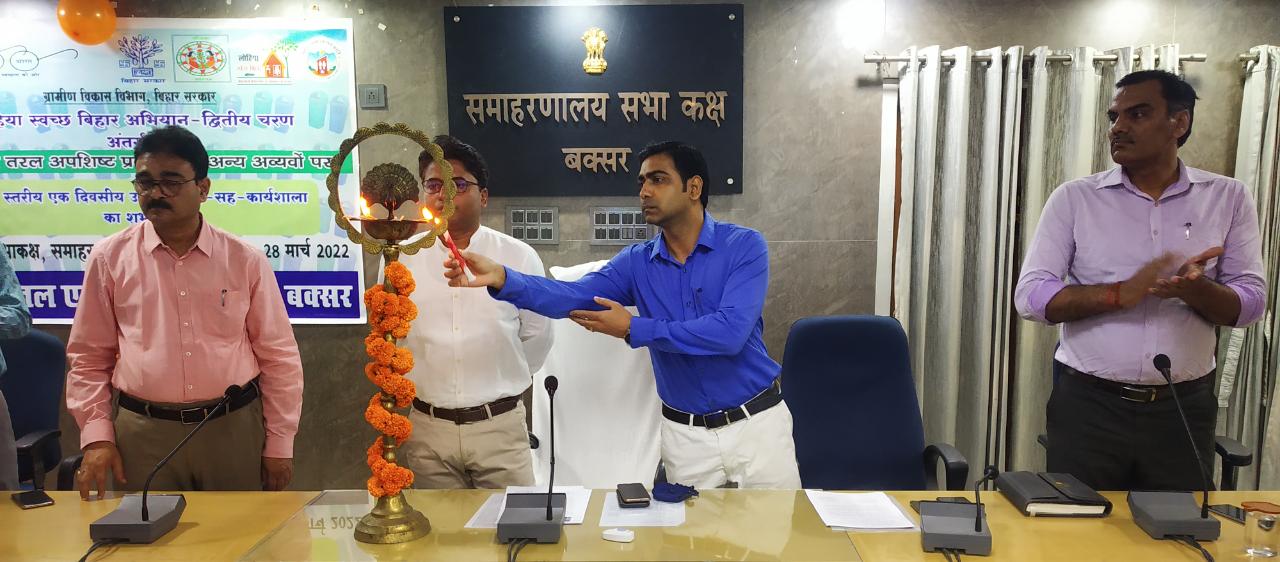 पदाधिकारी बक्सर श्री अमन समीर के द्वारा लोहिया स्वच्छ बिहार अभियान-द्वितीय चरण अंतर्गत ठोस एवं तरल अपशिष्ट प्रबंधन एवं अन्य अव्यवों पर जिला स्तरीय एक दिवसीय उन्मुखीकरण-सह-कार्यशाला का शुभारंभ द्वीप प्रज्जवलित कर समाहरणालय अवस्थित सभागार में किया गया।* *सक्षम बिहार स्वावलंबी बिहार के अंतर्गत सात निश्चय 2 में लक्षित स्वच्छ गाँव-समृद्ध गाँव के उद्देश्य की प्राप्ति के लिए लोहिया स्वच्छ बिहार अभियान द्वितीय चरण (2021-22 से 2024-25) में बक्सर जिले के सभी ग्राम पंचायतों द्वारा खुले में शौच से मुक्ति का स्थायित्व तथा चरणबद्ध तरीके से चयनित सभी ग्राम पंचायतों में ठोस एवं तरल अपशिष्ट प्रबंधन बनाया गया है। जिससे जिले के सभी ग्राम पंचायतों में स्वच्छ गाँव-समृद्ध गाँव की परिकल्पना को साकार किया जा सके। प्रथम चरण में बक्सर जिला अंतर्गत 47 ग्राम पंचायत को ठोस एवं तरल अपशिष्ट प्रबंधन को क्रियान्वित किया जाना है। जिला पदाधिकारी महोदय ने संबंधित प्रखंड विकास पदाधिकारी को उपरोक्त योजना के संबंध में पंचायत स्तर पर बैठक करने और कार्यों का पर्यवेक्षण करने का निर्देश दिया।**जिला स्तर पर एक दिवसीय उन्मुखीकरण-सह-प्रशिक्षण कार्यशाला में उप विकास आयुक्त बक्सर, जिला पंचायती राज पदाधिकारी बक्सर, निदेशक डी0आर0डी0ए0, जिला समन्वयक (SBM-G), जिला सलाहकार (CB&IEC), सलाहकार SLEM, जिला सलाहकार (MLE&MIS), जिला कार्यक्रम पदाधिकारी मनरेगा, कार्यपालक अभियंता मनरेगा पदाधिकारी एवं कर्मीगण उपस्थित थे।