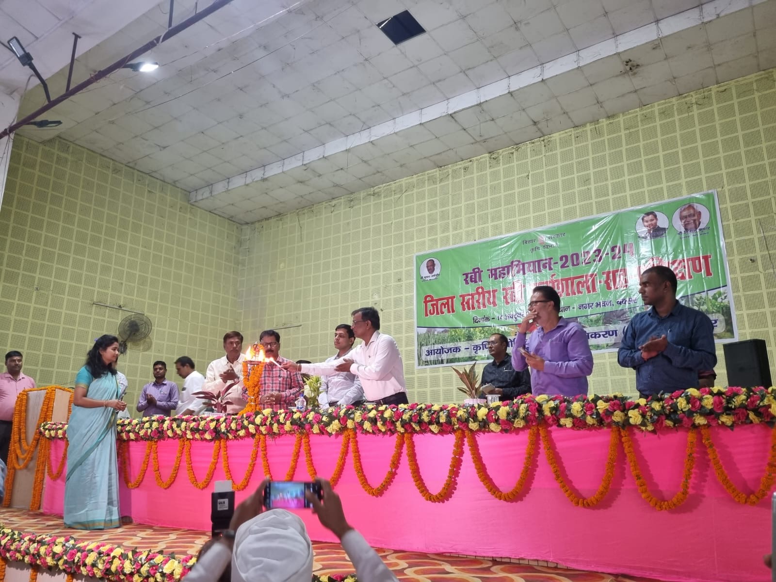 नगर भवन, बक्सर में कृषि विभाग (आत्मा), बक्सर के तत्वधान में जिलास्तरीय रबी कर्मशाला – 2023 का आयोजन किया गया। कार्यक्रम में जिला पदाधिकारी, बक्सर, उप विकास आयुक्त, बक्सर, जिला कृषि पदाधिकारी-सह-परियोजना निदेशक, बक्सर, जिला पशुपालन पदाधिकारी, बक्सर, जिला मत्स्य पदाधिकारी, बक्सर, कृषि विज्ञान केंद्र, बक्सर के वैज्ञानिक, अनुमण्डल कृषि पदाधिकारी, बक्सर, सहायक निदेशक, उद्यान, बक्सर, सहायक निदेशक, भूमि संरक्षण, बक्सर, सहायक निदेशक (कृ. अभि.) भूमि संरक्षण, बक्सर, उप परियोजना निदेशक, आत्मा, बक्सर, प्रखण्ड कृषि पदाधिकारी, कृषि समन्वयक, बीटीएम, एटीएम एवं अन्य कर्मी उपस्थित थे। कार्यक्रम का उद्घाटन जिला पदाधिकारी, उप विकास आयुक्त , जिला कृषि पदाधिकारी द्वारा संयुक्त रूप से दीप प्रज्ज्वलित कर किया गया। कार्यक्रम का संचालन श्री अमान अहमद, कृषि समन्वयक द्वारा किया गया। कार्यक्रम में बोलते हुए जिला कृषि पदाधिकारी, बक्सर द्वारा रबी- 2023 में कार्यान्वित की जाने वाली योजनाओं एवं बीज वितरण कार्यक्रम के बारे में जानकारी दी गयी। उनके द्वारा बताया गया कि दिनांक 16.10.2023 से 02.11.2023 तक प्रखंडस्तरीय रबी कर्मशाला का आयोजन होना है एवं कर्मशाला के अगले दिन उपादान वितरण का कार्यक्रम होना है। उपस्थित कर्मियों को सम्बोधित करते हुए उप विकास आयुक्त द्वारा किसानों को वैज्ञानिक विधि से खेती करने हेतु प्रेरित करने का निदेश दिया गया। साथ ही जैविक विधि से खेती करने के महत्व पर प्रकाश डालने के क्रम में बताया गया कि किसानों को अंधाधुन्ध उर्वरकों के प्रयोग से होने वाले नुकसान के बारे में भी बताएं एवं जैविक बिधि से खेती करने हेतु प्रेरित करें।