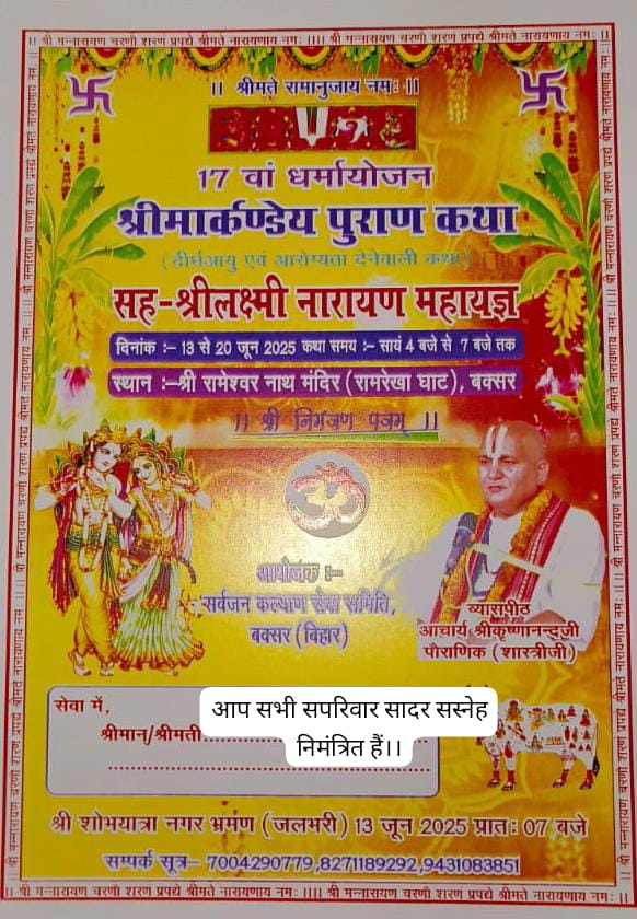 सर्वजन कल्याण सेवा समिति सिद्धाश्रम धाम बक्सर द्वारा आयोजित 17 th धर्म आयोजन श्री मार्कंडेय पुराण की कथा और श्री लक्ष्मी नारायण महायज्ञ के संदर्भ में यह ज्ञातव्य है कि समिति द्वारा इस नगर में प्रथम बार मार्कंडेय पुराण कथा ज्ञान यज्ञ का आयोजन किया जाएगा ।यह पुराण अत्यंत दिव्य है और अन्य पुराणों से इसका महत्व इसकी विशेषता इसका प्रभाव और सांसारिक दृष्टिकोण से इसके कल्याणकारी उद्देश्य अलग हैं। जैसा की स्पष्ट रूप से शास्त्रों में बताया गया है श्री मारकंडे मृकण्डु ऋषि के पुत्र थे और उनकी आयु केवल 8 साल की थी। 7 साल व्यतीत हो जाने के कारण जब इनको पता चला कि उनकी आयु केवल शेष एक साल बची हुई है तो यह भगवान शिव की आराधना करने लगे और लोगों से बोले कि मैं भगवान की भक्ति कर सिद्ध कर दूंगा की दुनिया की शक्ति शिव भक्ति में ही छिपी है। इनकी आराधना लगातार चली तथा 8 वर्ष की आयु जब समाप्त हुई तो यमराज के दूत आए और उनकी भक्ति के दिव्य पुंज से भयभीत होकर यमलोक चले गए। यमराज से अपनी बात बताएं की महाराज बालक में तो इतनी तेज शक्ति निकल रही है कि हम लोग उसके सामने टिक नहीं पा रहे हैं । जब यमराज आए तो देखें कि यह तेज पुण्य बालक अपनी दिव्य आभा और प्रकाश से संसार को आलोकित कर रहा है तो तब भगवान शिव से प्रार्थना की प्रभु आपने इनकी उम्र तो 8 साल रखी थी अब 8 साल व्यतीत हो गया तो इनको ले जाने का समय आया तो भगवान शिव ने कहा कि तुम यमराज अपने लोक में चले जाओ। मैं इस बालों को दीर्घायु बना दिया हूं अब यह चिरंजीवी हो गया है अब यह अजर अमर रहेगा। तो पहले सात लोग जीवित थे चिरंजीवी थे अश्वत्थामा, महाराज बली, श्री हनुमान जी ,भगवान वेदव्यास, विभीषण, कृपाचार्य, परशुराम इसके बाद मारकंडे श्री आठवें स्थान में चिरंजीवी के रूप में पहुंचे और उन्हीं के द्वारा यह मार्कंडेय पुराण संसार में प्रकट हुआ है। इस तरह से इस पुराण को सुनने तथा सुनाने वाले दीर्घायु होते हैं तथा सांसारिक संपदाओं से संपन्न होते हैं और किसी का अल्पायु जन्म नहीं होता है और सब तरह से भौतिक संपदाओं से संपन्न होते हैं ।अतः इस महापुराण के कथा का श्रवण करना अत्यंत सौभाग्य का विषय है। सर्वजन कल्याण सेवा समिति अपील करती है कि मानव समाज इस कथा को श्रवण करके धन्य और कल्याणकारी बने ।संपूर्ण संसार में अधिकांश लोग रोग ,विपत्ति से दुखी हैं ।शांति और शुभ का अभाव है, शारीरिक दृष्टि से लोग अपंग और अस्वस्थ होते जा रहे हैं, विविध प्रकार के रोग, नए-नए रोग से लोग ग्रसित होते जा रहे हैं इस स्थिति में श्री मार्कंडेय पुराण महा कल्याणकारी साबित होगा इसलिए इस कथा का श्रवण करने के लिए दिनांक 13 जून 2025 से 20 जून 2025 तक रामेश्वर नाथ मंदिर रामरेखा घाट बक्सर में कथा का आयोजन होना है। आप सभी नगर वासी ,जिलावासी, प