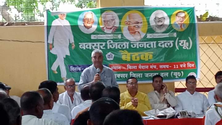बक्सर जिला के किला मैदान के मंच पर जनता दल यूनाइटेड की एक बैठक की गई जिसमें पार्टी की सदस्यता एवं संगठन के मुद्दों पर विस्तार पूर्वक चर्चा की गई जिसमें जिले के पदाधिकारी प्रदेश के पदाधिकारी सहित जिला प्रभारी पूर्व मंत्री श्री भगवान सिंह कुशवाहा पूर्व मंत्री संतोष कुमार निराला सह प्रभारी अजीत कुमार सिंह राष्ट्रीय कार्यकारिणी सदस्य रामबिहारी सिंह कमलेश सिंह प्रदेश सचिव धीरज कुशवाहा विनोद राय सहित तमाम नेताओं ने अपना अपना विचार व्यक्त किया जदयू जिलाध्यक्ष ने बताया कि बक्सर जिला को एक लाख सदस्य बनाना है जो बक्सर जनता दल यू का लक्ष्य है इस लक्ष्य की प्राप्ति के लिए गांव मोहल्ला टोला कस्बो आदि जगहों पर जनता दल यूनाइटेड के कार्यकर्ता नेता गण जन अभियान चलाकर पार्टी की सदस्यता के टारगेट को पूरा किया जाएगा इस कार्यक्रम में मुख्य रूप से अभिषेक पटेल संजय राजनेता मोहन चौधरी पंकज मानसिंका सिंह राजनेता विंध्याचल शाही लता श्रीवास्तव धर्मेंद्र ठाकुर नथुनी खरवार बिहारी पासवान संतोष चौधरी लाला सिंह जयप्रकाश चौधरी विनोद सिंह सुरेन्द्र कुशवाहा सिद्धेश्वर चौधरी रोहित ओझा शिवजी यादव बृजेष यादव प्रदीप राम प्रर्भु गोंड़ ब्रजनाथ पांडेय निर्मल पासवान भोला यादव दीना नाथ ठाकुर अमित यादव टुन्ना राम राधेश्याम आदि कार्यकर्त्ता उपस्थित थे।