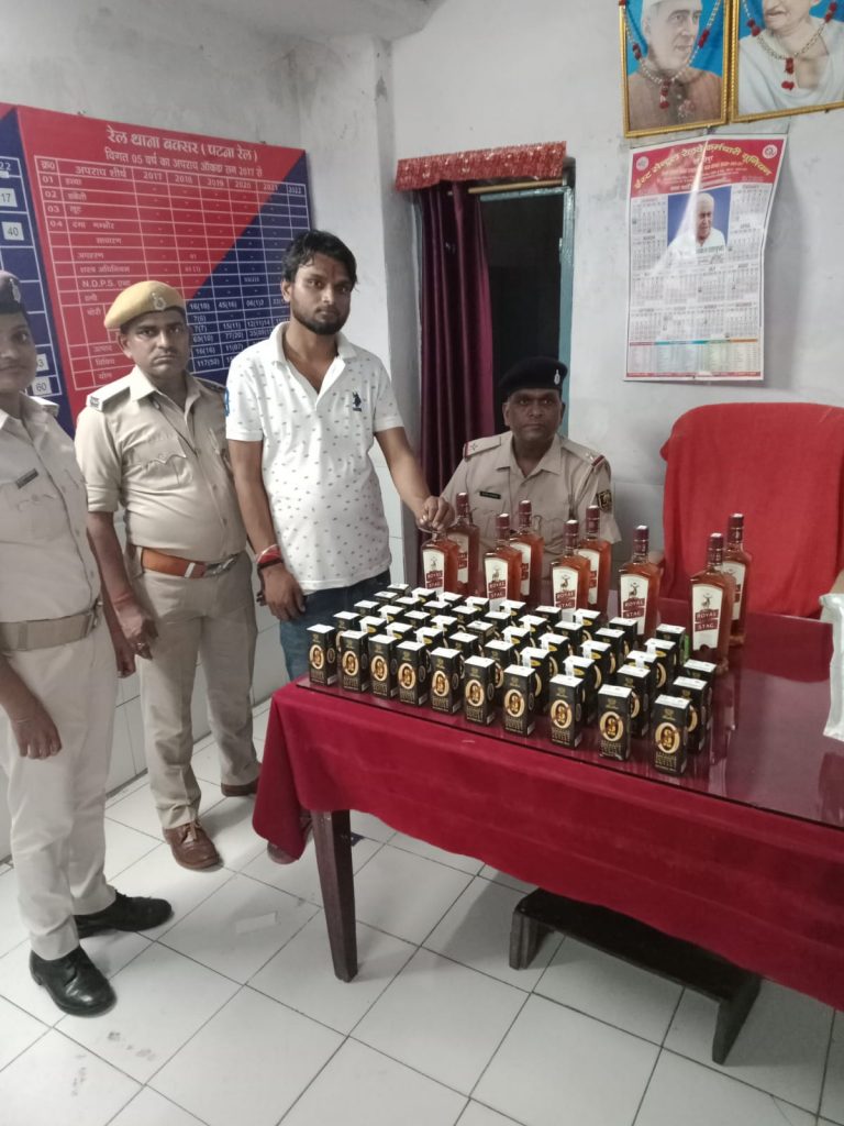 बक्सर जीआरपी रेलवे स्टेशन पर चौकस होकर प्रत्येक दिन जांच पड़ताल में लगी रहती है इसके परिणाम स्वरूप स्टेशन पर आए दिन नशीले पदार्थ पकड़े जा रहे हैं जीआरपी थाना प्रभारी रामाशीष प्रसाद ने बताया कि हमारी फोर्स सदैव तत्पर और सक्रिय रहकर स्टेशन पर आने जाने वाले मुसाफिरों को किसी प्रकार की परेशानी ना हो इसको भी बखूबी निभाती आ रही हैं एवं रात्रि गश्ती में स्टेशन के चारों तरफ नजर रखती है,रेलवे स्टेशन बक्सर प्लेटफार्म नंबर एक पर गाड़ी संख्या 12791 सिकंदराबाद एक्सप्रेस बोगी नंबर बोग s /8 के शौचालय के गेट के पास एक लड़का जिसका नाम सुबोधकुमार पिता काशी राय शौकीन हनुमान चौक थाना फतुहा जिला पटना के पास दो थैला में 9 बोतल रॉयल स्टैग व्हिस्की सभी का धारिता 750ml एवं 8pm व्हिस्की टेट्रा पैक सभी का धारिता 180ml के साथ पकड़ा गया रेल थाना बक्सर मैअग्रिम कार्रवाई की जा रही है