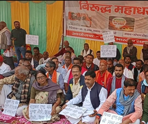 भारत के पड़ोसी मुल्क बांग्लादेश में इन दिनों हिन्दुओं पर लगातार अत्याचार किया जा रहा है।इसी क्रम में राष्ट्रीय भारतीय समाज बक्सर के बैनर तले बांग्लादेश में हो रहे हिंदुओं सिखों पर अत्याचार के विरुद्ध आज दिनांक 3 12 24 को स्टेशन रोड अंबेडकर चौक बक्सर पर एक महा धरना का आयोजन किया गया। धरने पर बैठे नेताओं ने अपने-अपने उद्बोधन में बांग्लादेश सरकार को जमकर लताड़ा और सरकार को चेतावनी भी दी की बांग्लादेश में हो रहे हैं अल्पसंख्यक हिंदूओं पर अत्याचार को तत्काल बंद किया जाए और पिडित हिंदुओं को तत्काल सहायता पहुंचाई जाए। इसी क्रम में इंटरनेशनल सोसाइटी फॉर कृष्ण कॉन्शियसनेस (ISKCON) क प्रमुख चिमन्य कृष्ण दास को बंगलादेश पुलिस द्धारा गिरफ्तार कर लिया गया।इसके बाद अब वहां ISKCON पर वैन लगाने की मांग तेज हो गयी है। आज से 4 महीने पहले 5 अगस्त 24 को बांग्लादेश में तक्था पलट के बाद से देश की हालत बिगड़ते जा रहे हैं ऐसा तब हुआ मुझे प्रधानमंत्री शेख हसीना की सरकार गिर गई और वह वहां से भाग कर भारत में रहने लगी। बात सिर्फ इस्कॉन मंदिर पर हमला करने की नहीं है बल्कि वहां मौजूद अन्य मंदिरों को भी कट्टरपंथी इस्लामी समुहों की तरफ से निशाना बनाया जा रहा है।
