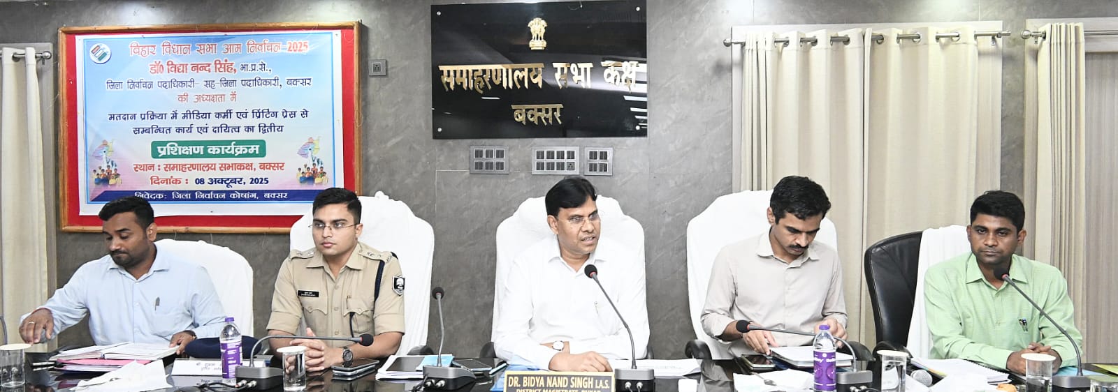 जिला निर्वाचन पदाधिकारी सह जिला पदाधिकारी बक्सर, डॉ विद्यानंद सिंह एवं पुलिस अधीक्षक बक्सर, श्री शुभम आर्य की संयुक्त अध्यक्षता में मतदान प्रक्रिया में मीडिया कर्मी से संबंधित कार्य एवं दायित्व का द्वितीय प्रशिक्षण कार्यक्रम समाहरणालय परिसर स्थित सभाकक्ष में की गई।