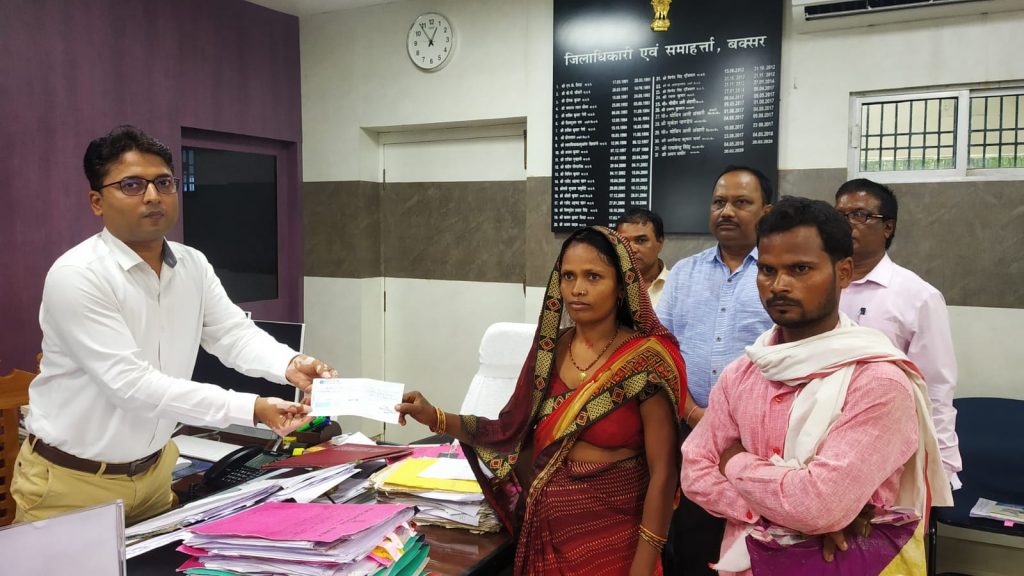 मस्कट में कार्य कर रहे प्रवासी मजदूर स्व0 धमेन्द्र पाल का मस्कट में देहान्त हो जाने के उपरान्त मस्कट सरकार के द्वारा अनुदान की राशि उपलब्ध करायी गयी थी। जिसके आलोक में आज दिनांक 27 सितम्बर 2022 को जिला पदाधिकारी बक्सर श्री अमन समीर के द्वारा समाहरणालय परिसर अवस्थित कार्यालय कक्ष में स्व0 धमेन्द्र पाल के आश्रित पत्नी धनवन्ती देवी ग्राम-कथराई, पोस्ट-मानिकपुर, थाना-धनसोई को 2833495.00 (अठाइस लाख तैतीस हजार चार सौ पनचानवे) रूपये का अनुदान राशि दिया गया।