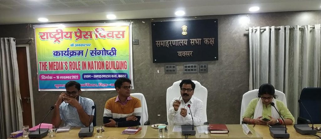 16 नवंबर 2022 राष्ट्रीय प्रेस दिवस मनाया गया उप विकास आयुक्त बक्सर डॉ महेंद्र पाल की अध्यक्षता में राष्ट्रीय प्रेस दिवस के अवसर पर कार्यक्रम/संगोष्ठी, समाहरणालय परिसर अवस्थित सभागार में आयोजित किया गया। जिसमें जिले के प्रिंट एवं इलेक्ट्रॉनिक मीडिया के पत्रकार एवं वरीय पदाधिकारी सम्मिलित हुए। प्रेस दिवस पर आयोजित संगोष्ठी का मुख्य विषय राष्ट्र निर्माण में प्रेस की भूमिका रही। संगोष्ठी में शामिल पत्रकारों ने उक्त विषय पर अपने विचार व्यक्त किया। उप विकास आयुक्त महोदय के द्वारा बताया गया कि मजबूत राष्ट्र निर्माण में प्रेस की भूमिका महत्वपूर्ण होती है पत्रकारिता में पॉजिटिव सोच रखते हुए कार्य करना चाहिए। जनता और प्रशासन के बीच में मीडिया एक संचार का माध्यम है। पत्रकार बंधुओ को निर्भीक होकर अपना कार्य करना चाहिए।