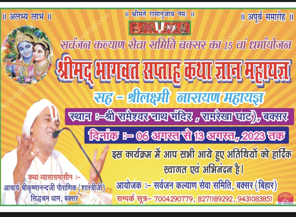 वैसे तो भगवान की पूजा की‌अनन्त विधियों का वर्णन मिलता है किन्तु मनुष्य अपने पैरों से भी भगवान की पूजा कर सकता है यह विधि अत्यल्प लोगों को पता है। सर्व जन कल्याण सेवा समिति बक्सर यह सौभाग्य दिनांक 6अगस्त 2023 दिन रविवार को बक्सर के लोगों को सुलभ कराने जा रही है। ज्ञातव्य है कि श्रीभद्भागवतकथा सह लक्ष्मीनारायणयज्ञ का भव्य आयोजन 6से13अगस्त 2023तक किया गया है। जिसकी शोभा(कलश) यात्रा नगर भ्रमण 6अगस्त दिन रविवार को प्रातःकाल सुबह 7बजे राम रेखा घाट रामेश्वर नाथ मन्दिर से निकलेगी । वेद,पुराण तथा स्मृति आदि के द्वारा बताया गया है कि धर्म के महान अंग यज्ञ में जब प्रातः काल कलश लेकर भक्त गण जल भरने हेतु यात्रा करते हैं तो भगवान श्री हरि उनके बढ़ते हुए एक-एक पग को अपनी पूजा के रूप में स्वीकार करते हैं।किन्तु ख्याल रहे कि कलश यात्रा सूर्योदय के 3 घंटे के भीतर प्रारंभ होकर मध्याह्न से पूर्व यज्ञ मण्डप पर पहुंच जाय।तभी पैरों से यज्ञनारायण की पूजा होगी । समिति का यह पन्द्रहवां धर्मायोजन है और प्रत्येक वर्ष समिति इसी नियम के तहत यज्ञ नारायण भगवान की पैरों से